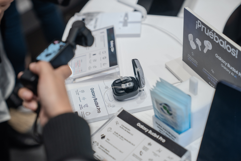 Durante las pruebas también estuvo la nueva serie de audífonos inalámbricos Galaxy Buds4, con su nuevo diseño ergonómico ultraelegante que mejora la comodidad al usarlos, y su audio Hi-Fi que reproduce cada detalle, desde los sonidos altos y resonantes de los violines hasta los pulsos profundos de los contrabajos.