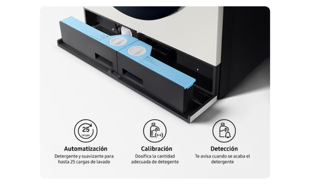 Además, avances de Samsung han introducido mejoras como AI Wash+ y Flex AutoDispenser también contribuyen al ahorro. La primera utiliza sensores que detectan el tipo de tela, la cantidad de ropa y el nivel de suciedad, ajustando automáticamente el agua, el tiempo y la cantidad de detergente necesarios. La segunda nos ayuda a evitar cargar detergente en cada lavada, ya que detecta el nivel de suciedad y lo ajusta de manera automática para evitar gastar más tiempo y agua en el ejuague.