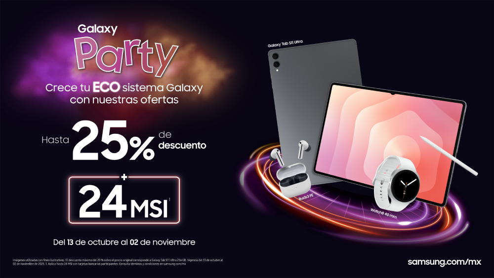 Samsung Electronics México anuncia la llegada de la Galaxy Party, una promoción especial que celebra la innovación, el diseño y la conectividad del ecosistema Galaxy. Durante este periodo, los usuarios podrán disfrutar hasta 25% de descuento y hasta 24 meses sin intereses (MSI) en productos seleccionados, disponibles en samsung.com/mx y en la Samsung Shop App, del 13 de octubre al 2 de noviembre de 2025.