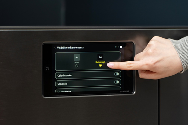 Guided by an accessibility-first approach, we constantly refine our designs across product development cycles, working closely with users to test and enhance usability. For instance, Samsung added audio guidance, color inversion or grayscale modes in their screen-equipped appliances for users with visual impairments. To make Samsung appliances easier to navigate, it keeps discovering new ways to enhance accessibility as shown in the award-winning[3] “Samsung Inclusive Essentials” concept, which aims to standardize sensory cues across products.
