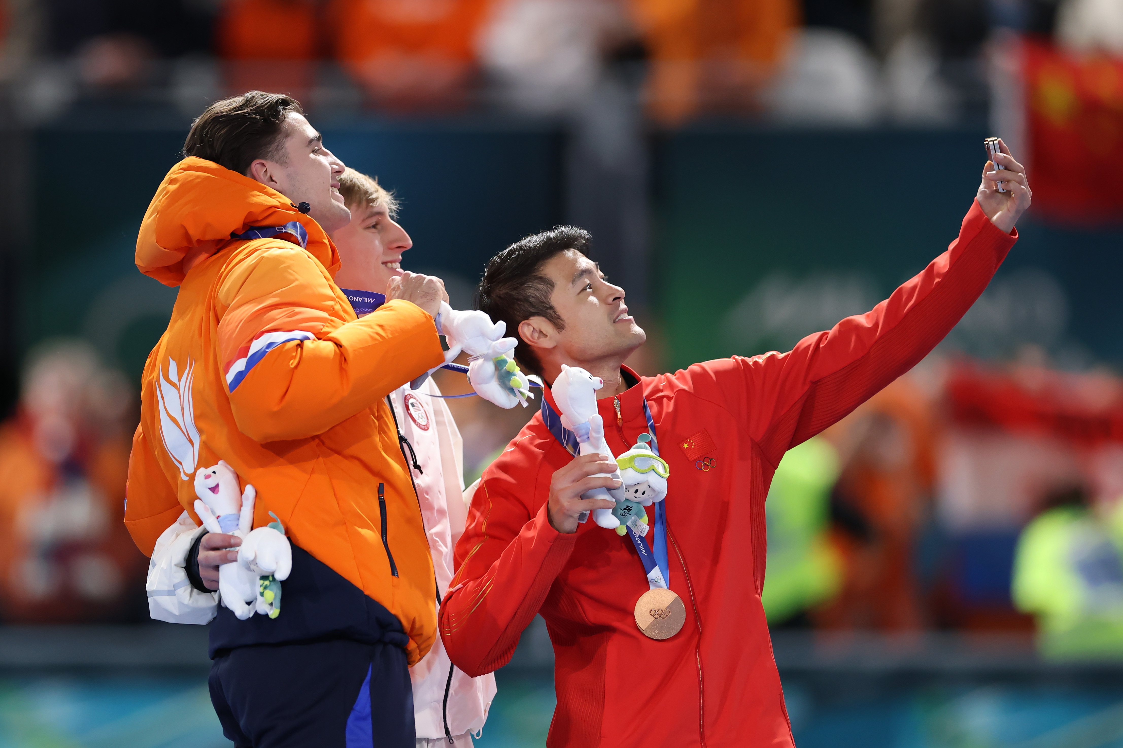 MILAAN, ITALIË – 11 februari: Goudwiinnaar Jordan Stolz van Team Verenigde Staten, zilverwinnaar Jenning de Boo van Team Nederland en bronswinnaar Zhongyan Ning van Team China vieren hun overwinning met een selfie op het podium tijdens de medaille-uitreiking voor de 1000 meter schaatsen voor mannen op de vijfde dag van de Olympische Winterspelen Milano Cortina 2026 in het Milano Speed Skating Stadium op 11 februari 2026 in Milaan, Italië. (Foto door Dean Mouhtaropoulos/Getty Images)