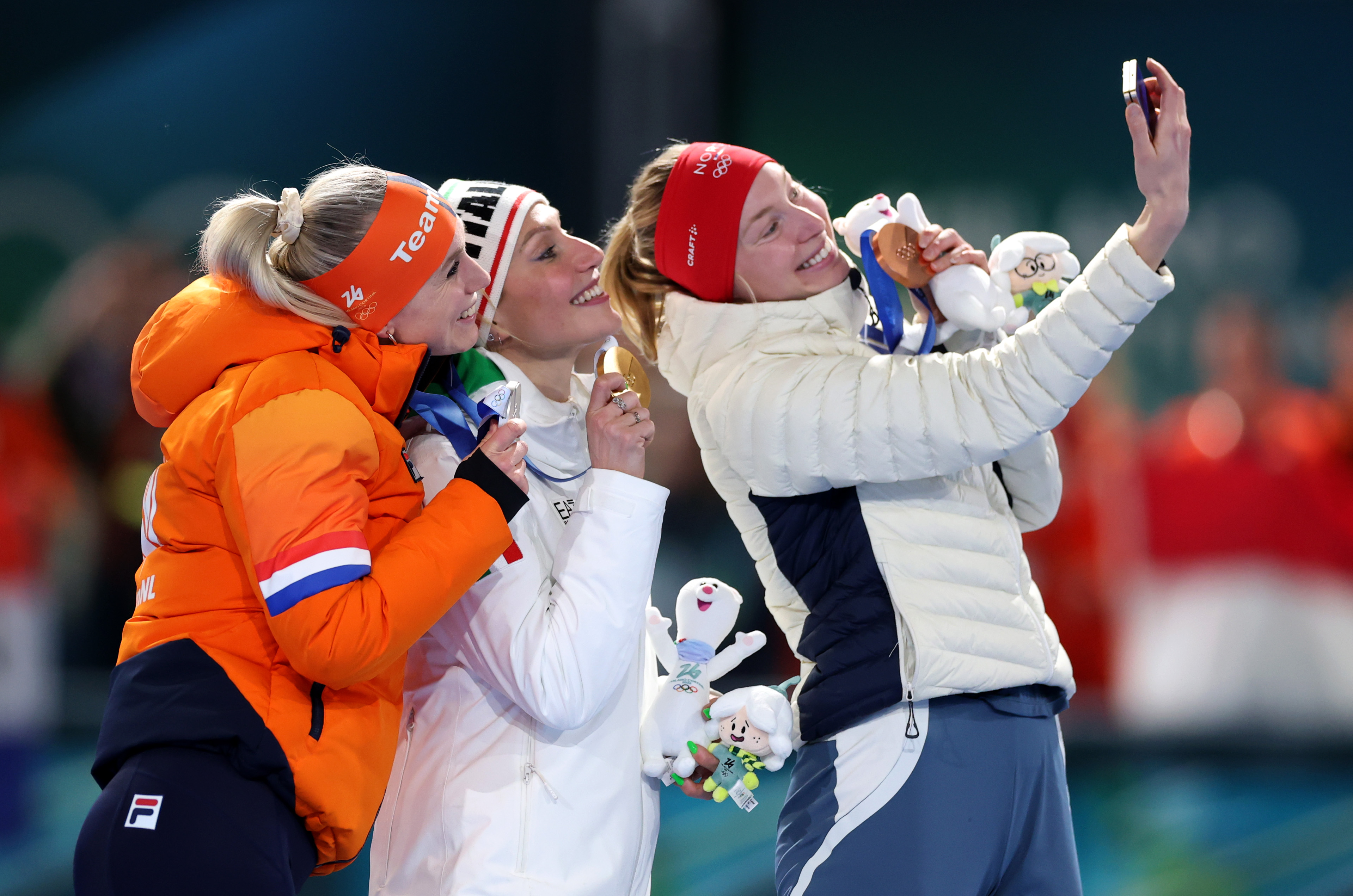 MILAAN, ITALIË – 12 februari: Gouden medaillewinnares Francesca Lollobrigida van Team Italië, zilveren medaillewinnares Merel Conijn van Team Nederland en bronzen medaillewinnares Ragne Wiklund van Team Noorwegen vieren hun overwinning met een selfie op het podium tijdens de medaille-uitreiking voor de 5000 meter schaatsen voor vrouwen op de zesde dag van de Olympische Winterspelen Milano Cortina 2026 in het Milano Speed Skating Stadium op 12 februari 2026 in Milaan, Italië. (Foto door Dean Mouhtaropoulos/Getty Images)