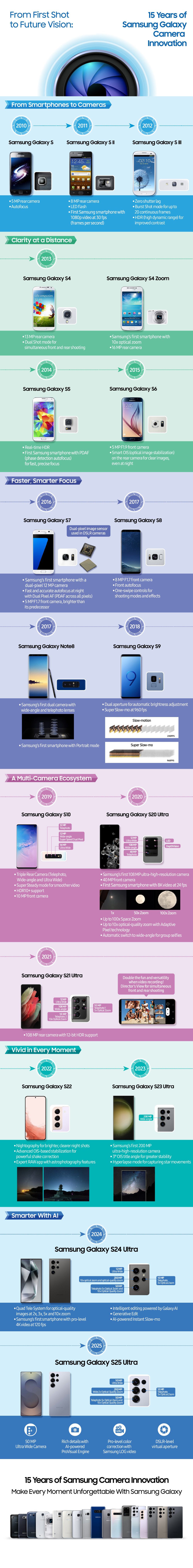 Helt siden tiden før smarttelefoner har Samsung Electronics introdusert mange innovasjoner innen ytelse og teknologi for mobilkameraer. Fra Galaxy S med et 5 MP kamera i 2010 – ved starten av smarttelefon-æraen – til Galaxy S25 Ultra med et 200 MP ultrahøyoppløst kamera, et 50 MP ultravidvinkelkamera og en rekke Galaxy AI redigeringsfunksjoner, har Samsung kontinuerlig utvidet hva brukerne kan gjøre med sine smarttelefonkameraer.