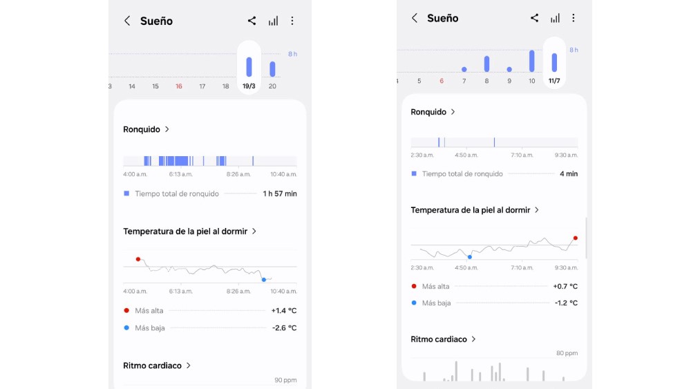 Los datos de sueño de Charly Pi antes (izquierda) y después (derecha) de la cirugía
