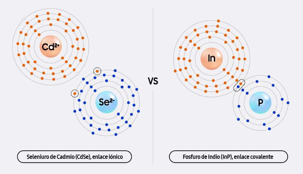 ▲ Comparación entre Quantum Dots basados en cadmio con enlaces iónicos y Quantum Dots basados en indio con enlaces covalentes