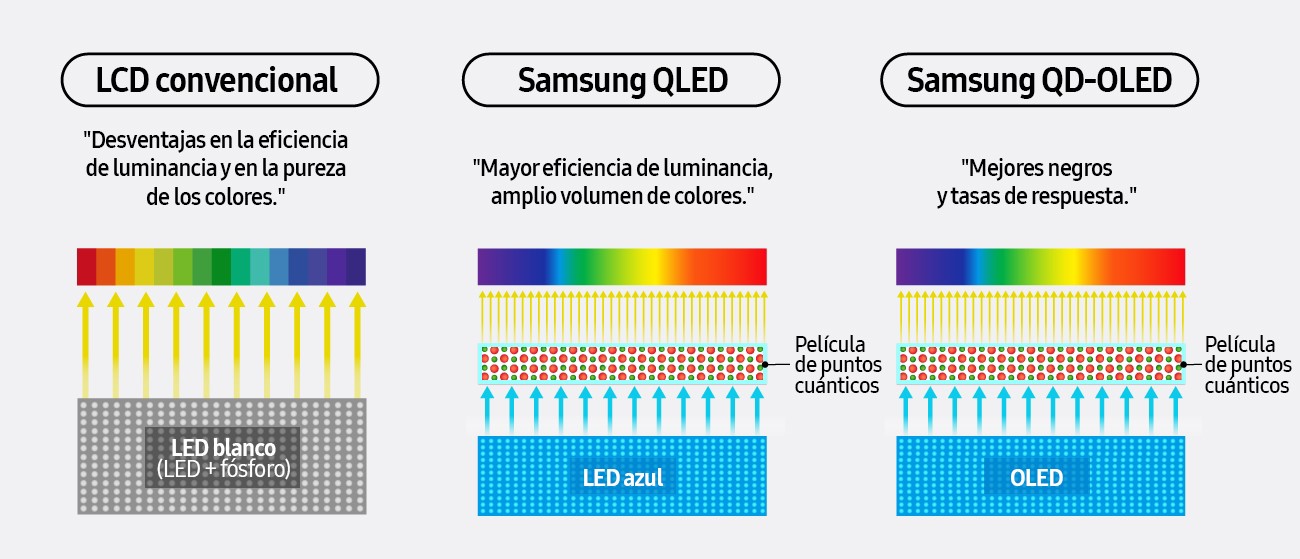 ▲ Comparación entre estructuras LCD, QLED y QD-OLED