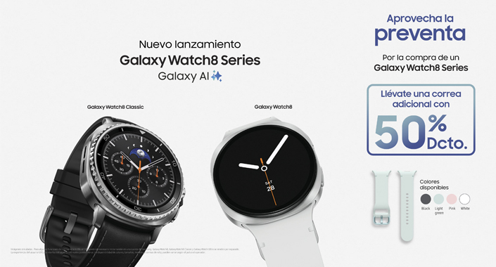 La preventa de la nueva serie Galaxy Watch8 ya está disponible a través de la App Samsung Shop y de la Tienda Oficial Samsung, hasta el 22 de agosto, con un beneficio exclusivo del 5% de descuento adicional para quienes se registren por primera vez. Además, como parte del lanzamiento, los usuarios podrán adquirir una correa adicional con 50% de descuento o los nuevos Galaxy Buds Core, por solo S/49 adicionales al comprar cualquiera de los nuevos relojes inteligentes, y así completar su ecosistema Galaxy.