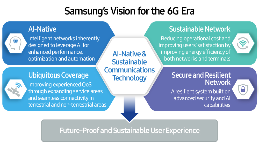 En consonancia con este cambio, Samsung lleva investigando 6G desde 2020. La compañía publicó su informe técnico “Comunicación 6G Nativa con IA y Sostenible” en febrero de 2025, donde describe los principales desafíos y la visión tecnológica para la comercialización de 6G. El informe destaca cuatro direcciones: IA Nativa, Red Sostenible, Cobertura Ubicua y Red Segura y Resiliente. Esto representa una estrategia de red integral que va más allá de la mejora del rendimiento para abarcar tanto la sostenibilidad como la preparación para el futuro.