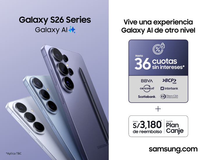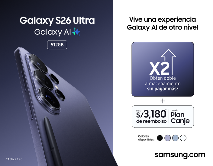 Samsung Perú dio inicio al periodo de preventa de la serie Galaxy S26 en el país, poniendo a disposición de los usuarios múltiples beneficios exclusivos durante esta etapa inicial. En el caso del Galaxy S26 Ultra, el público local podrá acceder a la versión de 512 GB (doble almacenamiento sin costo adicional), además de un reembolso de hasta S/ 3,180 mediante el Plan Canje, como parte de una propuesta orientada a facilitar el acceso a la nueva generación de smartphones.