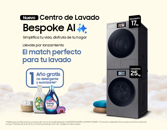 [2] Promoción válida por la compra de un Centro de Lavado Bespoke AI conformado por lavadora WF90F25ADSPE y la secadora DV90F17CDSPE del 13 de octubre al 30 de noviembre del 2025 y/o hasta agotar stock de 100 promociones. Válido solo para Lima Metropolitana y ciudades de Arequipa, Trujillo, Chiclayo, Piura, Cusco, Huancayo, Chimbote e Ica.