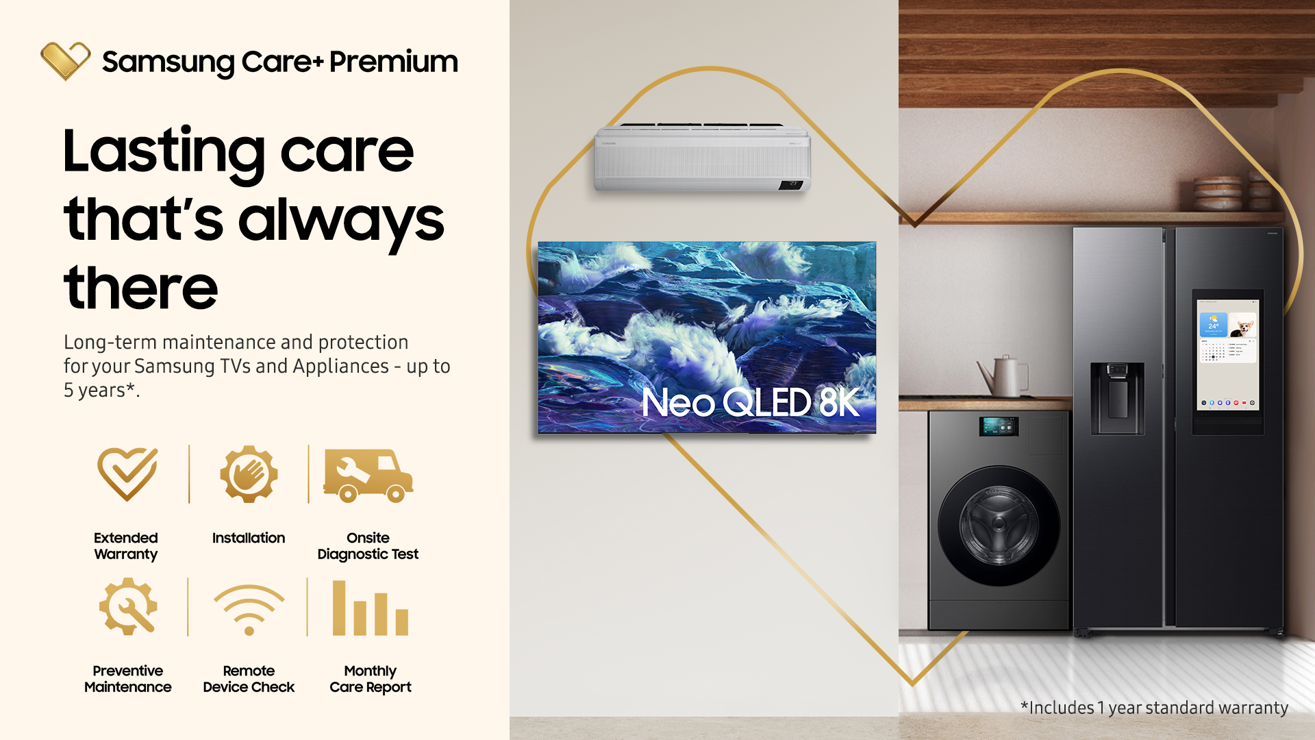 Whether it’s enjoying vibrant family nights with Vision AI TVs, cooling down with Samsung WindFree™ air conditioners, or relying on Bespoke AI™ appliances for everyday house chores, Samsung Care+ Premium enhances your smart lifestyle with worry-free moments at home. This premium service extends protection for your appliances with up to five years of warranty coverage*, which is longer than the standard period, allowing you to maximize the life and performance of your investments.