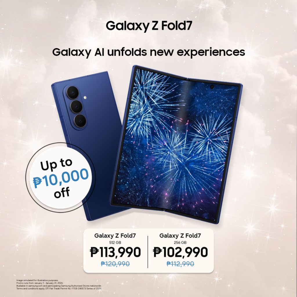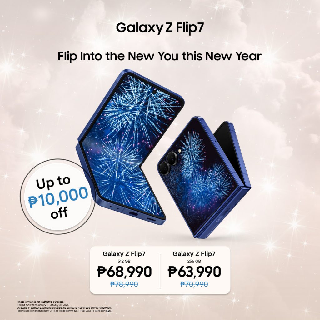 The Ultimate Ecosystem Flex For those upgrading via carrier, purchase a Galaxy Z Fold7 (256GB) or Galaxy Z Flip7 (256GB) from Globe or Smart between January 1 and January 31 to receive a ₱8,000 Samsung.com eVoucher. Use your voucher on Samsung.com or the Samsung Shop App to discount flagship smartphones, Galaxy S tablets, or the latest wearables and hearables. Vouchers are valid until March 31, 2026, and can be used alongside existing bundle offers and cashback for maximum impact.
