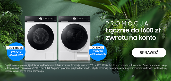 Kup pralkę lub suszarkę Samsung, zostaw opinię i odbierz do 800 zł zwrotu – aż do 1600 zł przy zakupie obu urządzeń!