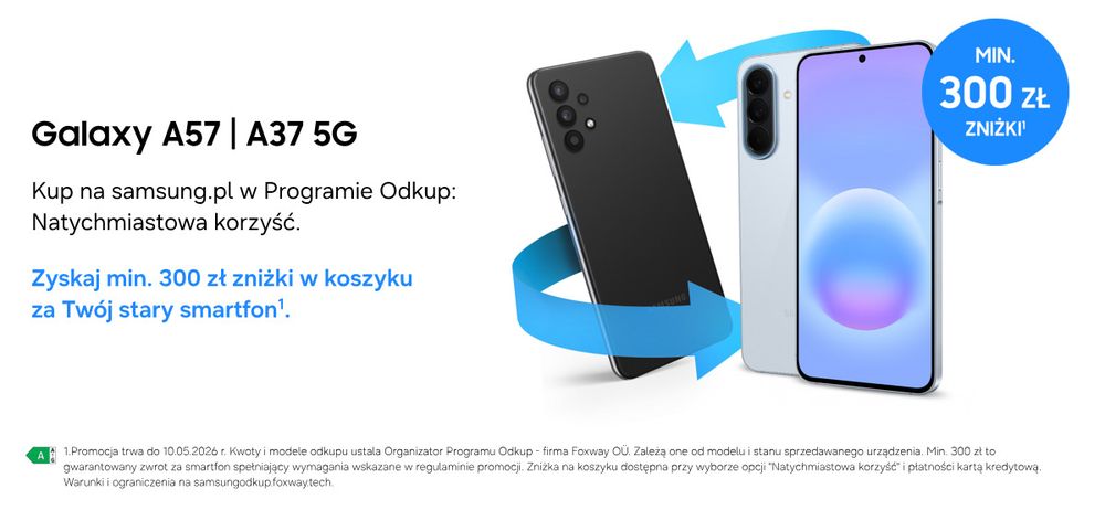 - Promocja trwa do 10.05.2026 r. Kwoty i modele odkupu ustala Organizator Programu Odkup – firma Foxway OÜ. Zależą one od modelu i stanu sprzedawanego urządzenia. Min. 300 zł to gwarantowany zwrot za smartfon spełniający wymagania wskazane w regulaminie promocji. Zniżka na koszyku dostępna przy wyborze opcji “Natychmiastowa korzyść” i płatności kartą kredytową. W przypadku wyboru opcji “Przelew na konto” kwota przelewu za sprzedane urządzenie będzie wynosiła co najmniej 300 zł. Warunki i ograniczenia na samsungodkup.foxway.tech. Szczegóły w regulaminie promocji na stronie https://images.samsung.com/is/content/samsung/assets/pl/regulaminy_2026/Regulamin_Promocji_Odkup_A37_A57.pdf