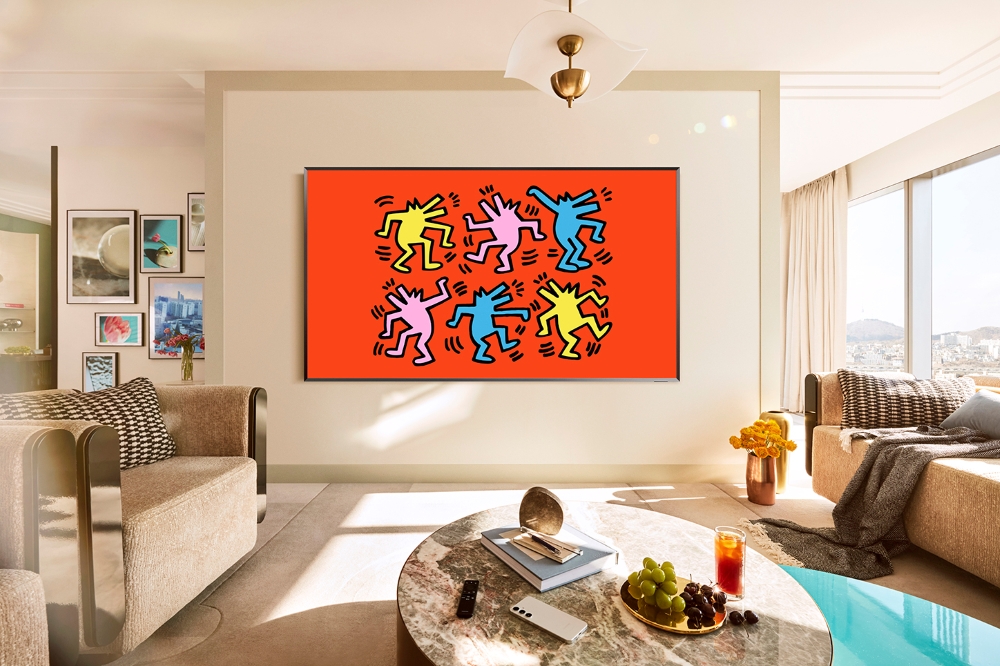▲ „Dancing Dog” de Keith Haring afișat pe Samsung Neo QLED 8K 2025. Toate lucrările lui Keith Haring © Keith Haring Foundation. Licențiat de Artestar.