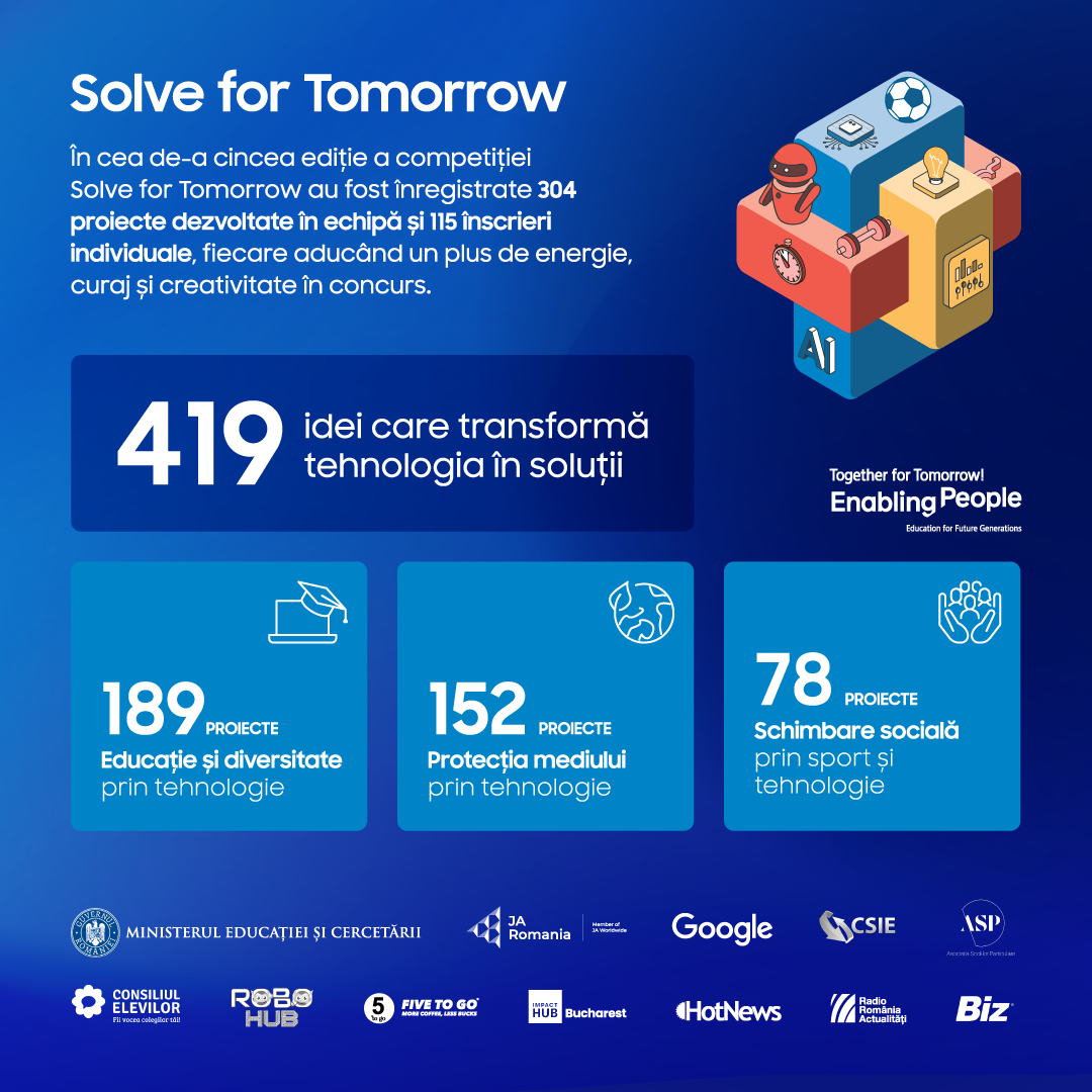 Solve for Tomorrow, program educațional cu o tradiție de 15 ani la nivel internațional, se află anul acesta la cea de-a cincea ediție în România și continuă să fie un reper pentru elevii care folosesc tehnologia pentru a aborda probleme reale din comunitățile lor. Ediția 2025–2026 aduce și câteva elemente noi. În premieră, Samsung România a organizat o tombolă pentru profesorii coordonatori care au înscris rapid proiecte în platformă – o modalitate de a recunoaște rolul esențial pe care acești mentori îl au în susținerea și formarea elevilor. Totodată, programul extinde experiența de învățare a finaliștilor, prin ateliere și workshop-uri (design thinking, antreprenoriat, tehnici de prezentare, AI & deepfake), completate de un nou modul de sport și reziliență, menit să îi ajute să gestioneze presiunea, emoțiile și eșecurile, abilități esențiale pentru inovare.
