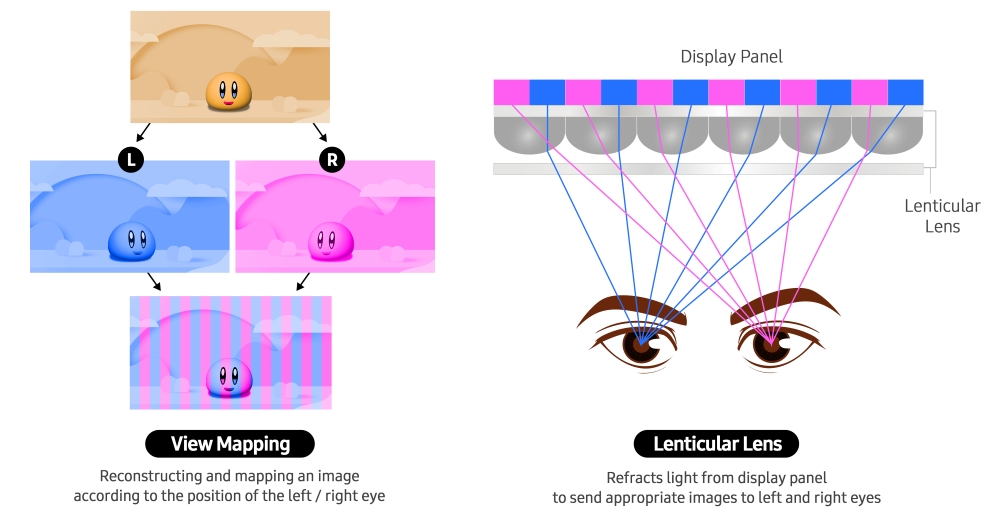 В основе Odyssey 3D лежат три ключевые технологии: отслеживание глаз (Eye Tracking), корректировка отображения для создания глубины (View Mapping) и использование лентикулярных линз (Lenticular Lens).