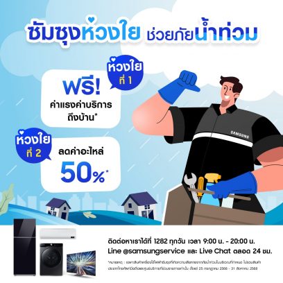 ซัมซุงห่วงใยผู้ประสบภัยน้ำท่วม ส่งทีมช่างลงพื้นที่ภาคเหนือ 4 จังหวัด มอบบริการพิเศษฟรีถึงบ้าน พร้อมมอบส่วนลดค่าอะไหล่ 50%