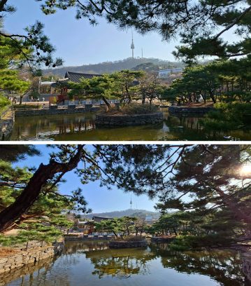 (จากบนลงล่าง) ภาพบรรยากาศยามค่ำคืนในกรุงโซลที่ถ่ายด้วยฟีเจอร์ Nightography บน Galaxy A57 5G และภาพผลลัพธ์ที่ได้