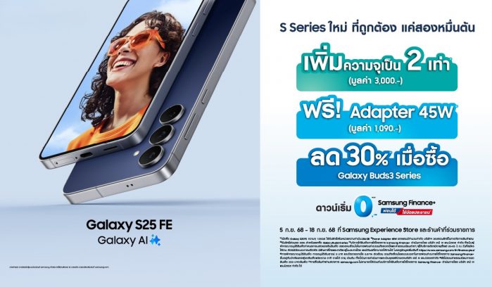 ซัมซุง เปิดตัว S Series ตัวซีเคร็ต ต้อนรับ Samsung Galaxy S25 FE สมาชิกใหม่ล่าสุดจาก Galaxy S25 Series ในราคาสุดคุ้ม ที่มาพร้อม One UI 8 มอบประสบการณ์ในการใช้งานด้วย Galaxy AI ตัวล่าสุด ชูจุดเด่นในฐานะผู้ช่วย AI ส่วนตัว ส่งโปรโมชันพิเศษ ตั้งแต่วันที่ 5 ก.ย. – 18 ก.ย. 68 นี้เท่านั้น