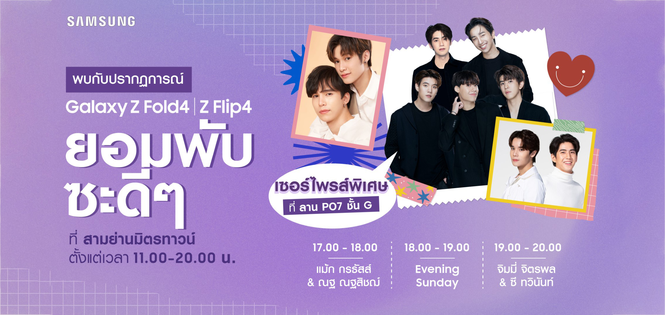 Samsung Galaxy Z Fold4 I Z Flip4 ชวนมาพับซะดีๆ กับนักร้องนักแสดงวัยรุ่นสุดป๊อป แม้ก-กรธัสส์ และณฐ-ณฐสิชฌ์, วง Evening Sunday, จิมมี่-จิตรพล และซี-ทวินันท์ ที่งาน Flip Phenomenon 28 ตุลาคมนี้ มาพับกันให้ทั่วสามย่านมิตรทาวน์!