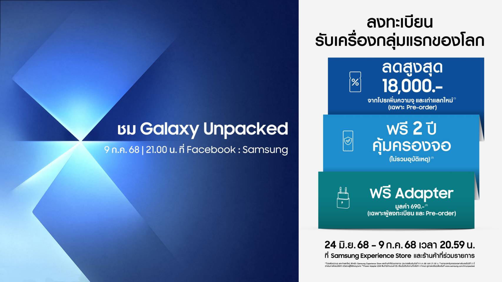 เตรียมต้อนรับพับครั้งใหม่! ล่าสุด ซัมซุงเผยกำหนดการจัดงาน Galaxy Unpacked ชวนแฟน ๆ ทั่วโลกรับชมพร้อมกันทาง Facebook: Samsung วันที่ 9 กรกฎาคม 2568 เวลา 21.00 น. พร้อมเปิดลงทะเบียนรับ The new Galaxy กลุ่มแรกของของโลก จัดโปรฯ ฟรีคุ้มครองจอ 2 ปี ใช้งานอุ่นใจหายห่วง และอัดแน่นสิทธิพิเศษสุดคุ้มจากซัมซุง เริ่มลงทะเบียนฟรี รับโปรฯ ได้ก่อนใคร ที่ https://bit.ly/PR-release-250624 ตั้งแต่วันนี้ – 9 กรกฎาคม 2568 ที่ Samsung Experience Store และร้านค้าที่ร่วมรายการ