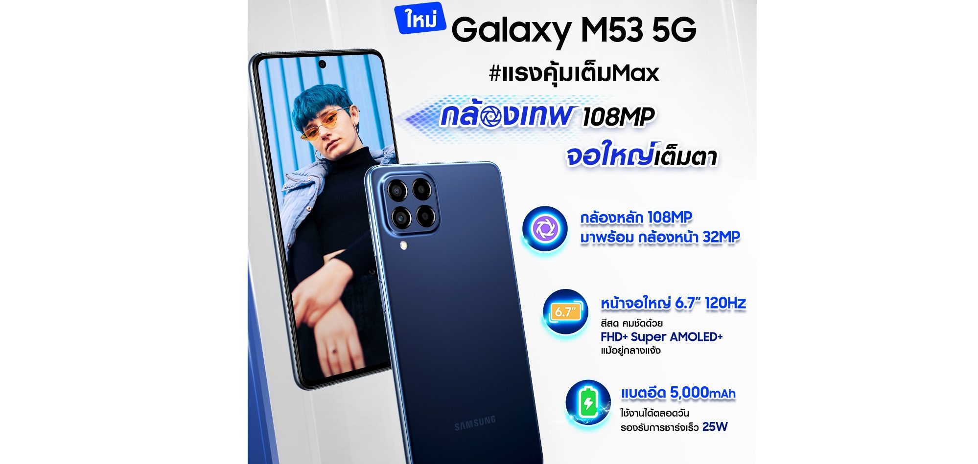 ซัมซุง เปิดตัว Galaxy M53 5G สมาร์ทโฟนแรงคุ้มเต็ม Max มาครบทั้งกล้องเทพ สเปคทรงพลัง จอใหญ่คมชัดเต็มตา พร้อมโปรพิเศษในราคาเพียง 12,499 บาท เฉพาะวันที่ 1 – 15 มิถุนายนนี้เท่านั้น!