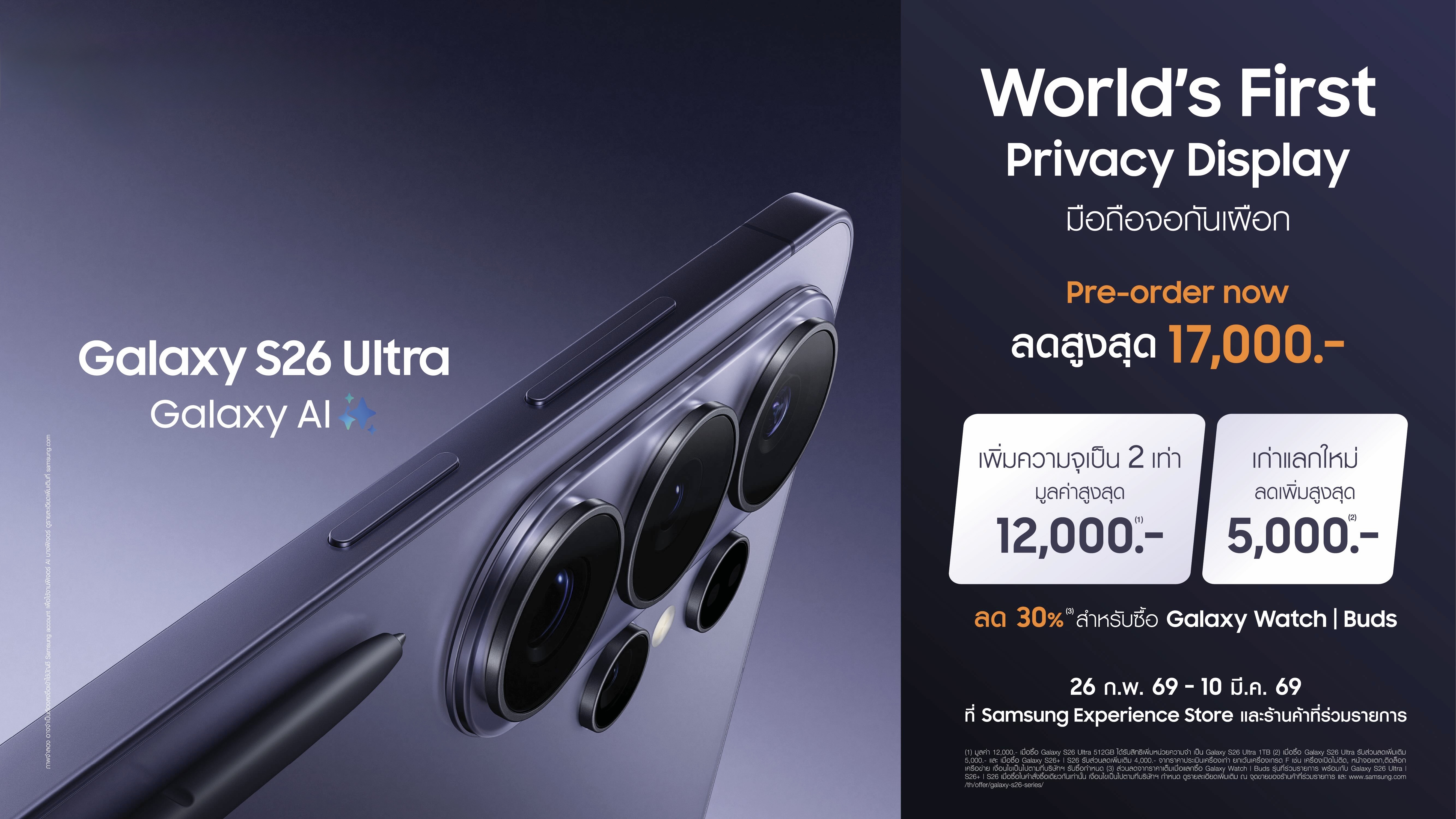 ใหม่! ซัมซุงเปิดสั่งจองล่วงหน้า Galaxy S26 Ultra ครั้งแรกของโลก Privacy Display จอมือถือเพื่อความเป็นส่วนตัว