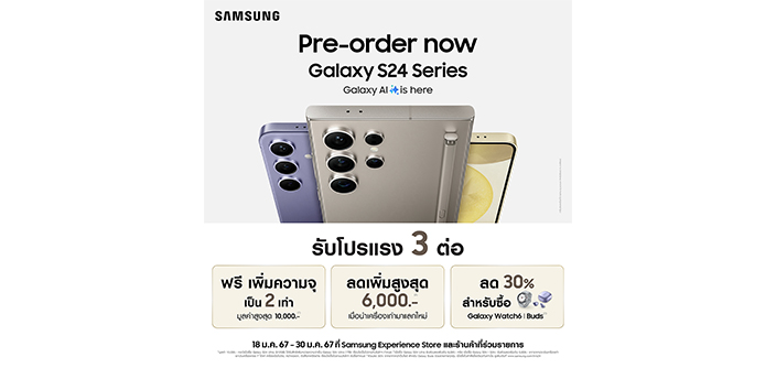 พร้อมวาร์ปสู่กาแล็คซี่ใหม่ Samsung Galaxy S24 Series สั่งจองล่วงหน้าวันนี้ รับโปรโมชั่นสุดคุ้ม วันนี้ – 30 มกราคม นี้เท่านั้น!!!