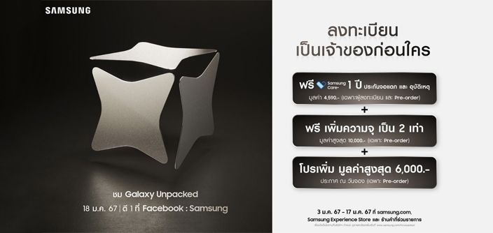 นับถอยหลังวาร์ปสู่โลกใหม่กับ Galaxy AI ในงาน Galaxy Unpacked ชมการเปิดตัวพร้อมกันทั่วโลก 18 มกราคมนี้ 01.00 น. พร้อมสัมผัสเครื่องจริงก่อนใครได้ที่ Galaxy Experience Space