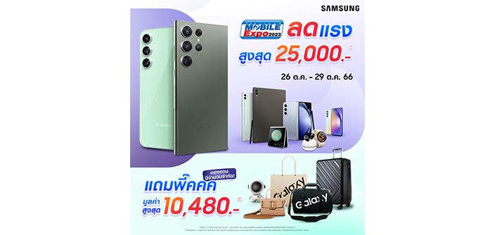 ซัมซุงขนมาทั้งกาแล็คซี่กับโปรโมชั่นพี๊คคคๆลดสูงสุดกว่า 25,000.- พร้อมรับของแถมจุกๆ และยังได้พบกับ Galaxy OPEN MARKET ให้ได้ร่วมสนุก กับกิจกรรมสุดพิเศษพร้อมสัมผัสประสบการณ์เหนือระดับ แล้วมาพบกันที่งาน Thailand Mobile Expo 2023 วันที่ 26 ต.ค. – 29 ต.ค. 2566