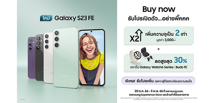 เริ่มเลย! Galaxy S23 FE สมาร์ทโฟนแฟลกชิปน้องใหม่จากซัมซุง วางจำหน่ายแล้ววันนี้ พร้อมโปรเปิดตัว…อย่างพี๊คคค ฟรีเพิ่มความจุเป็น 2 เท่า ถึง 5 พ.ย.นี้เท่านั้น