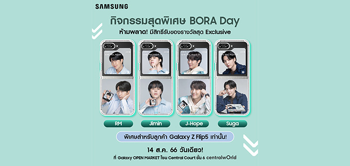 ซัมซุงชวนทุกคนร่วมกิจกรรมแบบจัดเต็มสุดสัปดาห์นี้ที่ Galaxy OPEN MARKET พิเศษสำหรับแฟนคลับของ 4 หนุ่ม RM SUGA J-Hope และ Jimin กับกิจกรรม BORA Day ลุ้นรับของรางวัลสุดเอ็กคลูซีฟ พลาดไม่ได้เด็ดขาด!