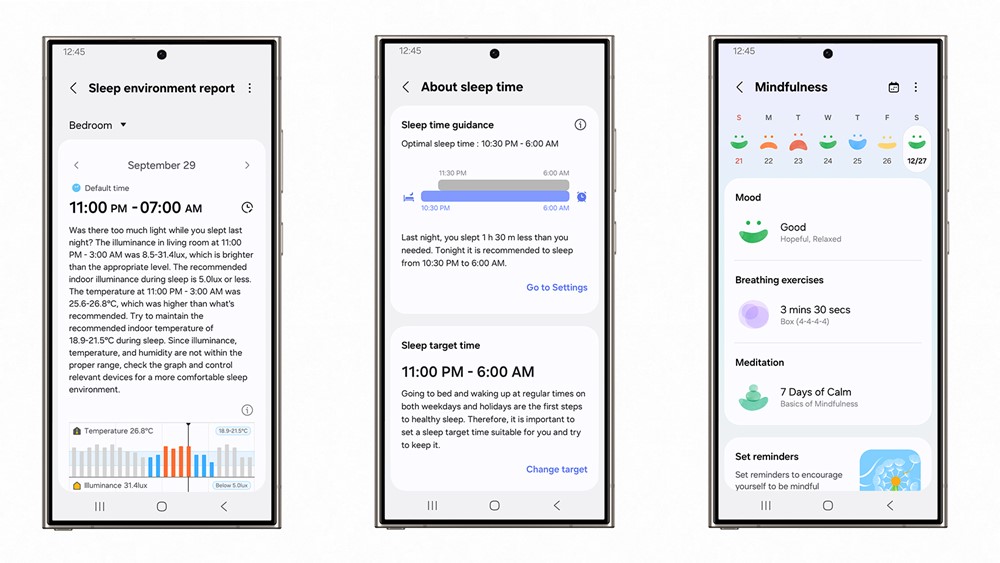 - SmartThings ile kullanıldığında Samsung Health; odadaki sıcaklık, nem, hava kalitesi ve ışık yoğunluğu gibi faktörleri değerlendirerek uyku ortamını analiz ediyor. Kullanıcı, sabah, çevresindeki koşulları nasıl optimize edebileceğine dair öneriler sunan bir Uyku ortamı raporu4 Ayrıca, uykuya dalındığında ideal uyku ortamını oluşturmak için SmartThings özelliklerinden yararlanarak oda ayarlarını otomatik olarak ayarlamak ve dinlendirici bir gece uykusunu desteklemek de mümkün.