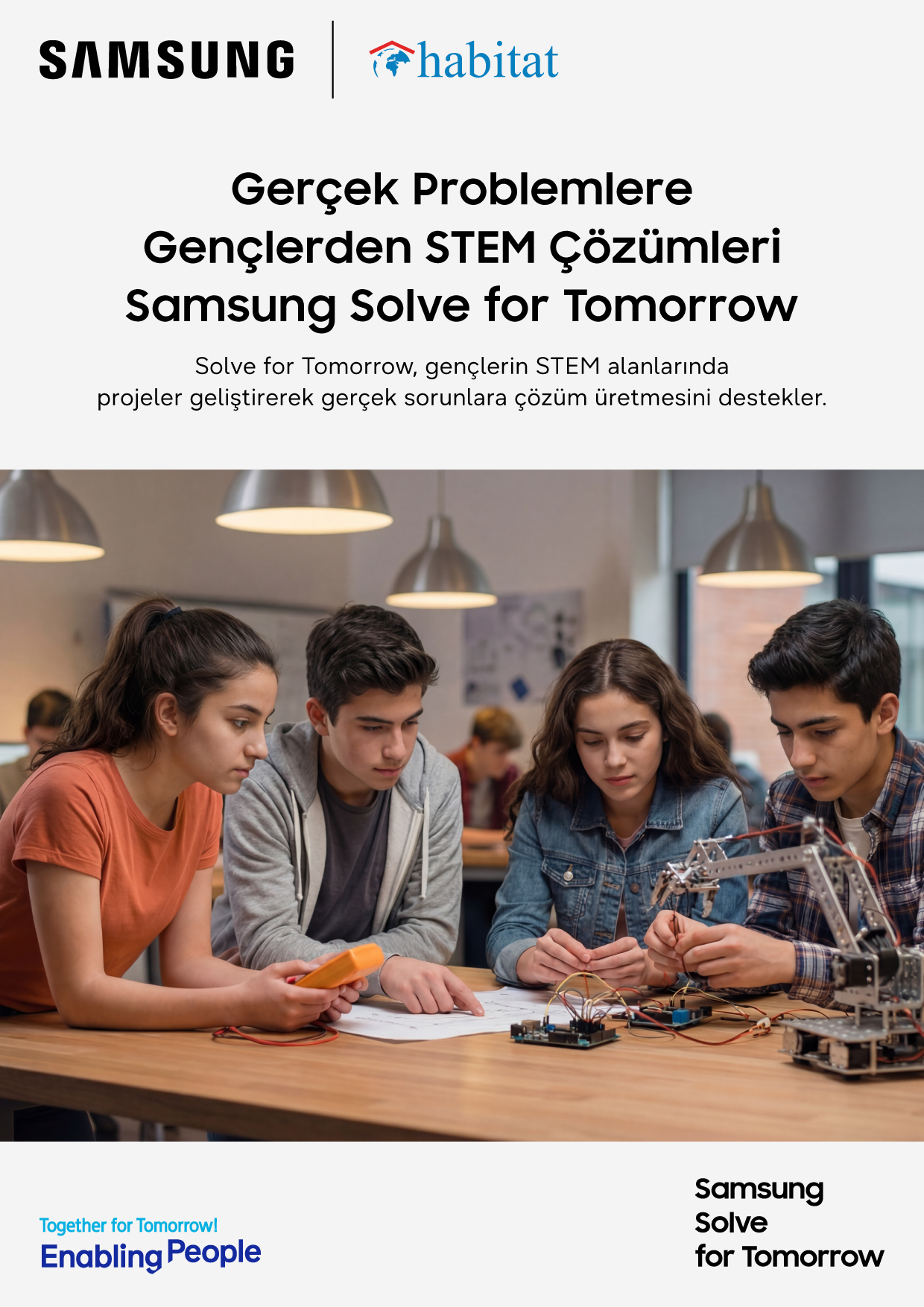 Samsung Electronics’in dünya genelinde yürüttüğü Samsung Solve for Tomorrow programı, gençlerin bilim, teknoloji, mühendislik ve matematik (STEM) alanlarında yaratıcı düşünmelerini desteklemeyi ve geliştirdikleri projelerle topluma fayda sağlayan çözümler üretmelerini amaçlıyor. Dünya genelinde 68 ülkede uygulanan ve bugüne kadar 2,9 milyondan fazla öğrencinin katıldığı program, 2021 yılından bu yana Habitat Derneği iş birliğiyle Türkiye’de de yürütülüyor. Program bugüne dek ülkenin dört bir yanından 7500’den fazla öğrenciye ulaştı.