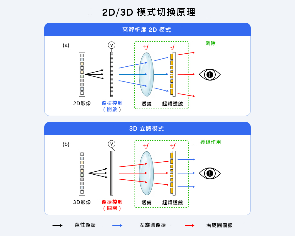 ▲示意圖:超穎透鏡如何根據偏振控制器的狀態,在高解析度2D與立體3D模式之間進行切換
