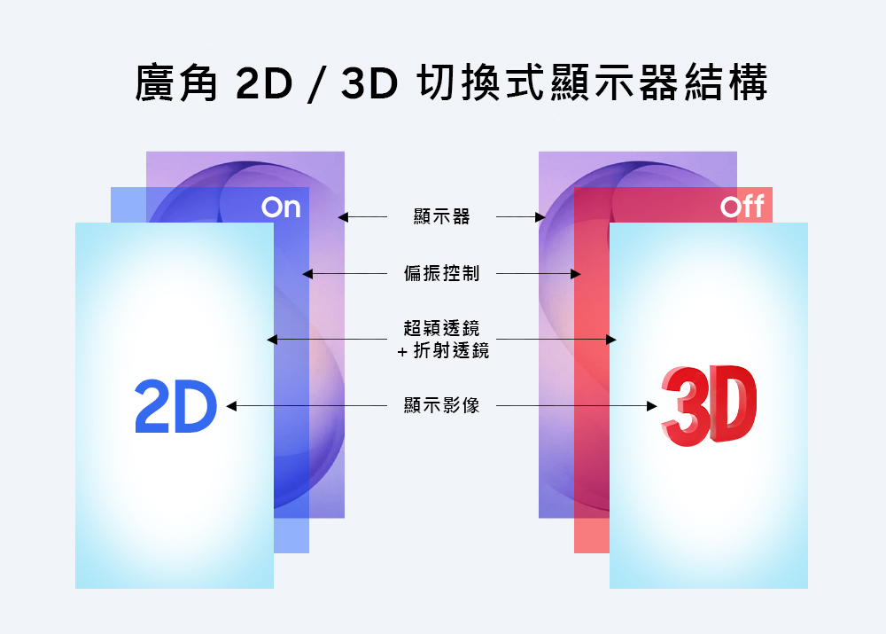 該模組根據顯示器前方的偏光控制器,切換超穎透鏡的凹面鏡與凸面鏡模式。在2D觀看模式下,例如閱讀或瀏覽內容時,超穎透鏡可發揮凹面鏡的作用(控制器開啟),消除凸面鏡的發散效果,使光線像穿透平面玻璃般直射,產生清晰的影像。