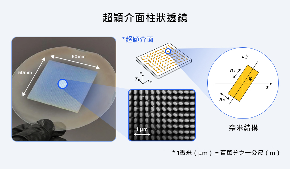 ▲(左起)精心設計的超穎介面柱狀透鏡(50 × 50 mm, 25 cm²)和奈米級結構,使柱面透鏡發揮絕佳作用