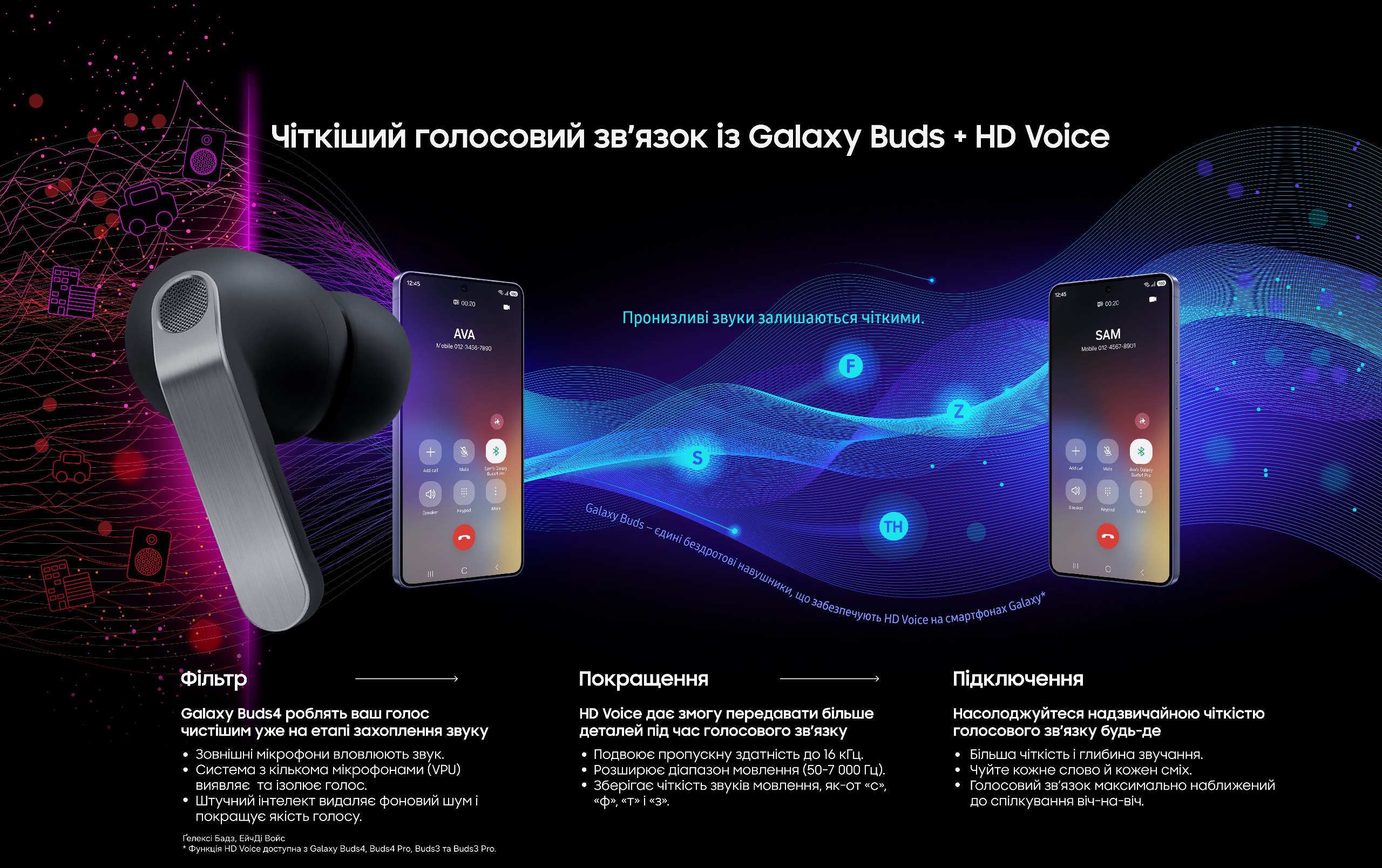 Чіткість починається з передового шумозаглушення на основі штучного інтелекту. Серія Galaxy Buds4 використовує кілька мікрофонів, які збирають звуки з різних напрямків, а також модуль Voice Pick Up Unit (VPU), який допомагає виявляти та надавати пріоритет голосам користувачів. Потім вдосконалені мережі аналізують звук у реальному часі, щоб відокремити мову від фонового шуму, такого як транспорт, вітер або інші розмови поблизу.