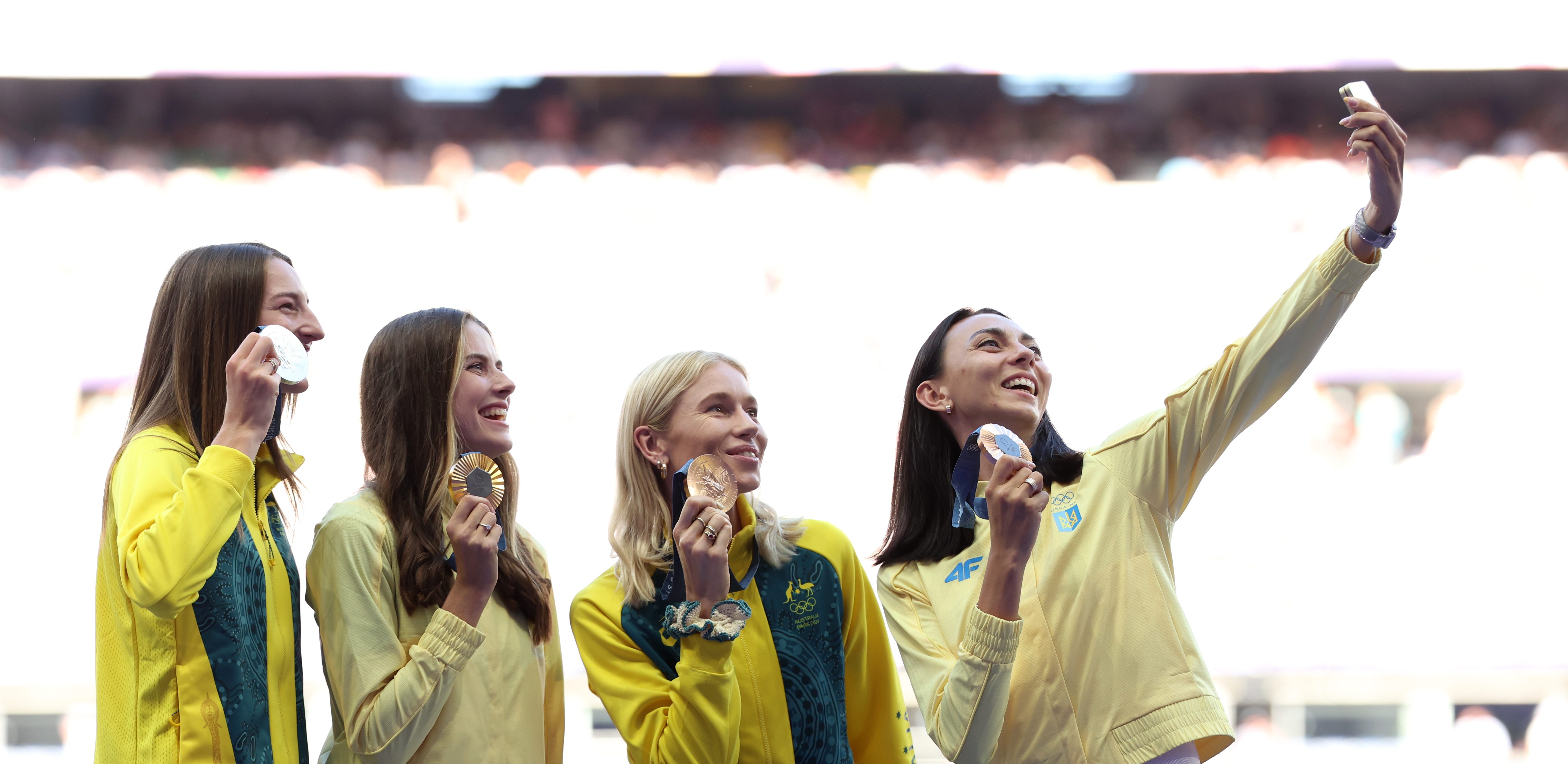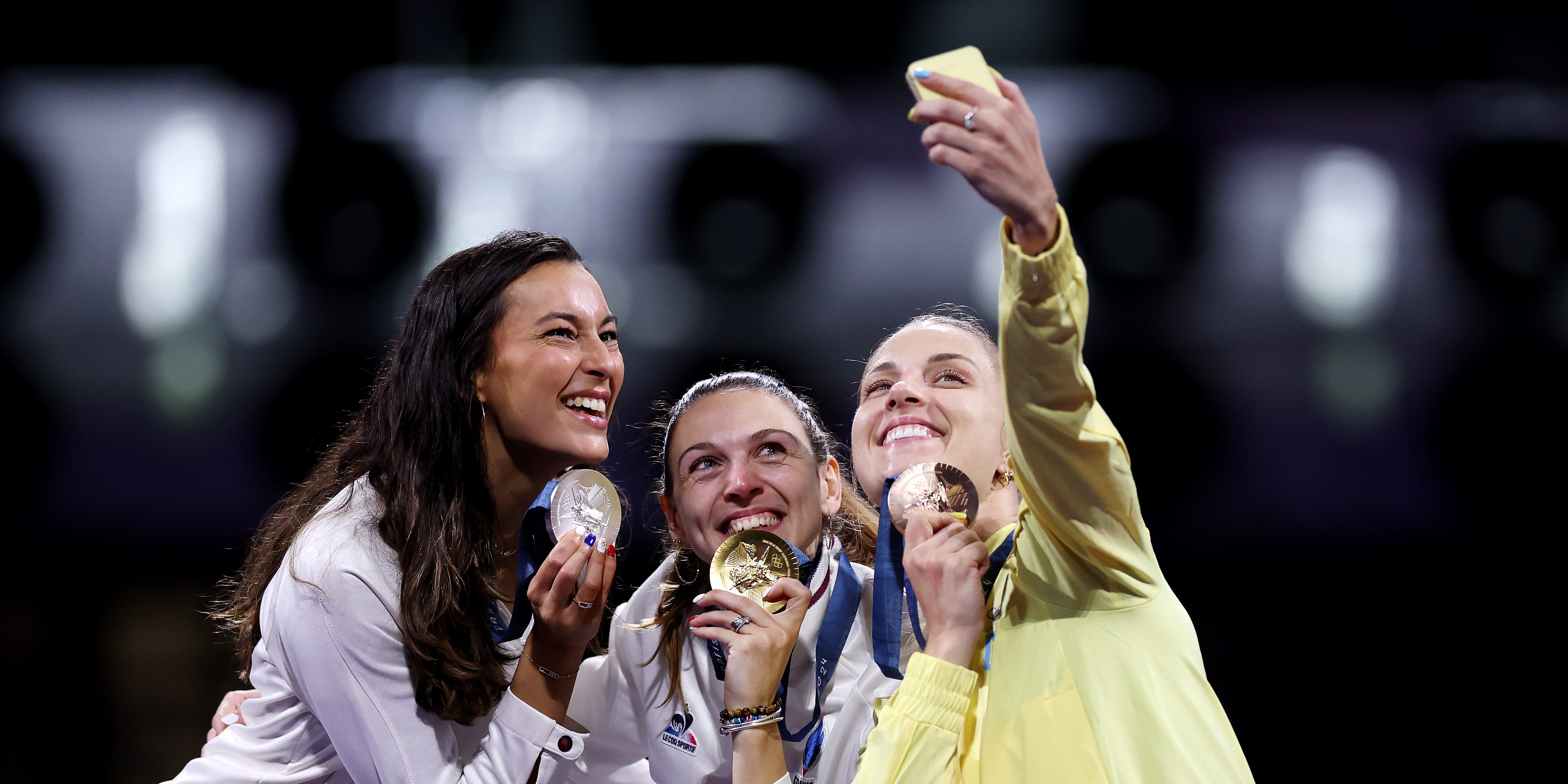 Медалісти Олімпіади на п’єдесталі пошани роблять селфі на Galaxy Flip6 Olympic Edition
