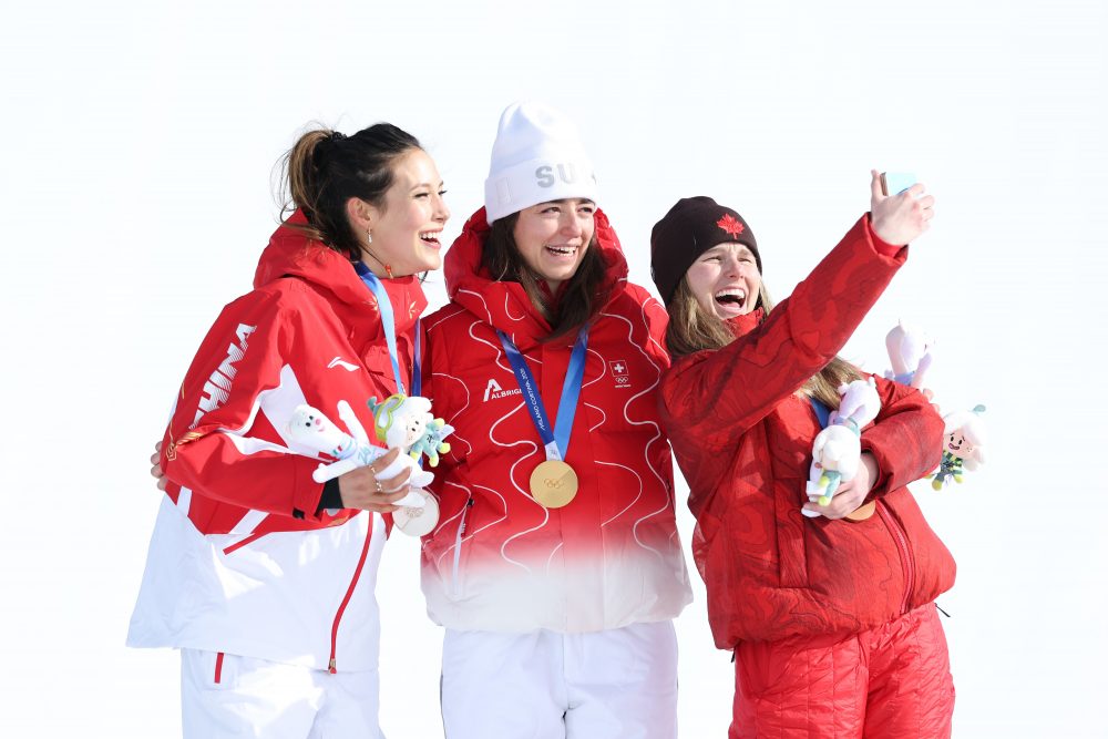 LIVIGNO, ITALY – FEBRUARY 9: Gold medalist Mathilde Gremaud of Team Switzerland, Silver medalist Ailing Eileen Gu of Team People’s Republic of China and Bronze medalist Megan Oldham of Team Canada selfie on the podium after winning the Women’s Slopestyle Final on day three of the Milano Cortina 2026 Winter Olympic games at Livigno Snow Park on February 9, 2026 in Livigno, Italy. (Ian MacNicol/Getty Images)