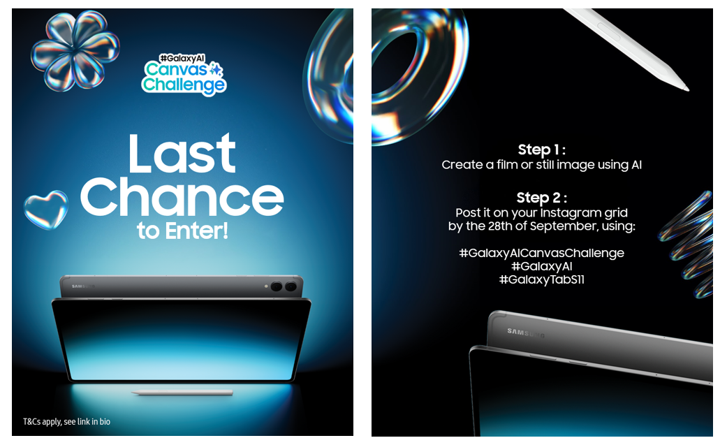 Competition is open to residents of the UK and ROI 16+ with a valid and public Instagram account only. Enter between 10/09/25 and 28/09/25 by posting a grid post or Reel of an image or film (max. 90 seconds) of an artwork made using help of AI with emphasis on the creativity, uniqueness, originality, talent, and use of AI features with the hashtags #GalaxyAICanvasChallenge AND #GalaxyAI AND #GalaxyTabS11 for a chance to win a Galaxy Tab S11 Ultra. Entries submitted on a private Instagram account will not be eligible. Maximum of ten (10) Entries per valid public Instagram account. Winner chosen by panel of judges based on Winning Criteria. Entries created on non-Samsung devices are not eligible for the First Place Prize. Winner has three days from notification to claim. For full T&Cs and winning criteria, see Samsung_TabAI_Creator-Competition.pdf.