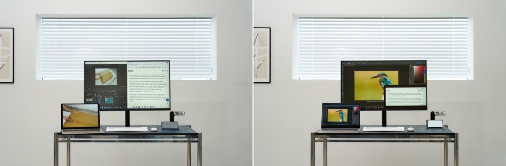 In PBP mode, users can connect a laptop and a smartphone to use each side of the monitor as a separate display. For example, users can keep a reference video open on the laptop while editing on ViewFinity S8 and browsing related articles. Switching inputs is simple with the built-in KVM switch, allowing everything to be managed from one place.