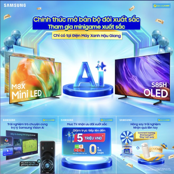 Ngày 21 tháng 04 năm 2026 – Công ty Điện tử Samsung Việt Nam hợp tác cùng hệ thống Siêu thị Điện máy Xanh ra mắt hai dòng AI TV mở bán độc quyền, bao gồm TV OLED S85H và TV Mini LED M8X. Bộ đôi sở hữu hiệu suất hình ảnh, âm thanh vượt trội cùng Trợ lý Vision AI Companion đa nhiệm mới nhất.