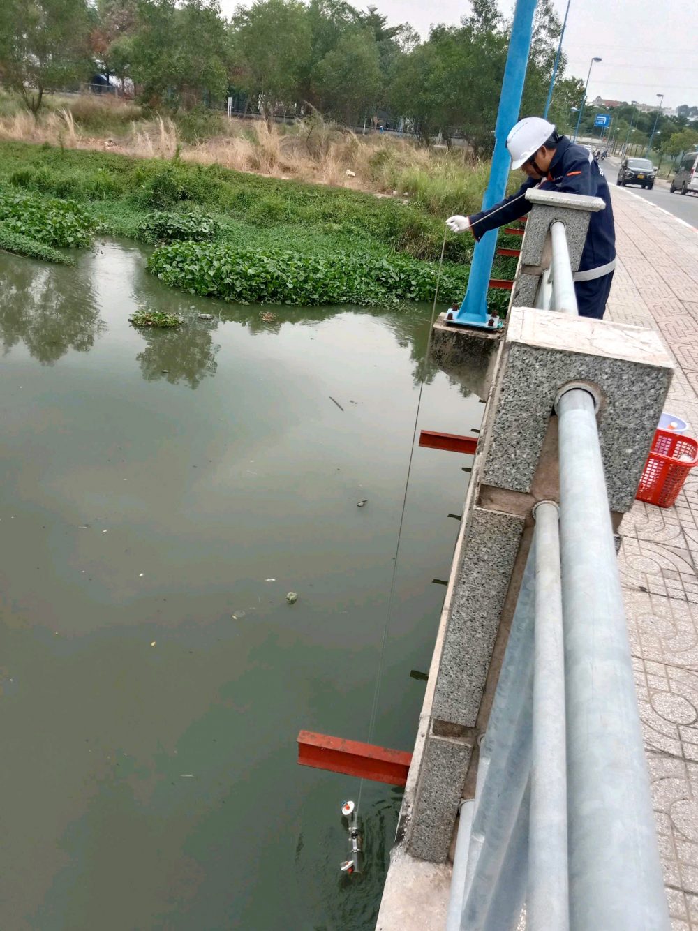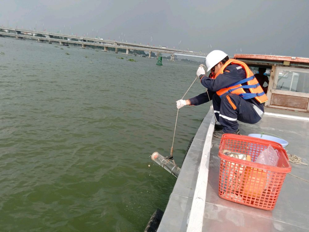 Nhân viên Trung tâm Công nghệ và Quản lý Môi trường thực hiện quan trắc chất lượng nước tại điểm Hóa An, sông Đồng Nai