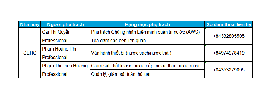 SEHC cam kết tuân thủ nghiêm ngặt tiêu chuẩn AWS, đóng góp tích cực vào hệ sinh thái nước toàn cầu, đảm bảo nguồn nước được sử dụng một cách thông minh và bền vững.