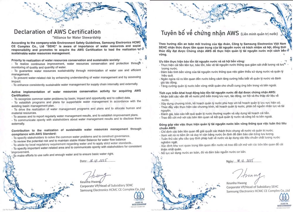Năm 2024, Công ty TNHH Samsung Electronics HCMC CE Complex (SEHC) tiên phong công bố cam kết bảo tồn tài nguyên nước với Tiêu chuẩn AWS (Alliance for Water Stewardship) và đạt được chứng nhận hạng Bạch Kim vào năm 2025. Bước sang năm 2026, nhà máy tiếp tục khẳng định quyết tâm hiện thực hóa sứ mệnh này thông qua bản “Tuyên bố Chứng nhận AWS” được ký bởi Tổng Giám đốc Keunha Hwang vào ngày 16/12/2025. Điều này thể hiện tầm nhìn chiến lược về quản lý tài nguyên nước bền vững với ba nội dung cơ bản.