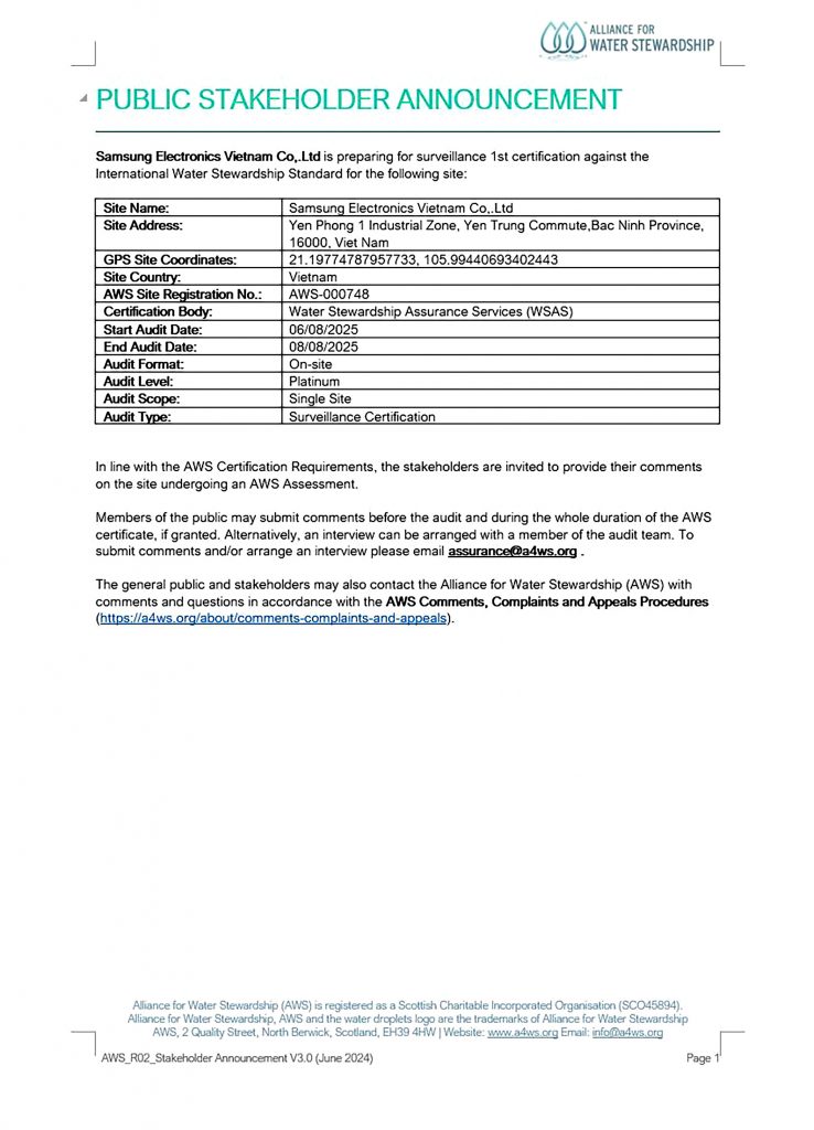 Samsung Electronics Vietnam Co,.Ltd đang chuẩn bị đánh giá tái chứng nhận tiêu chuẩn quản lý nước quốc tế theo thông tin như sau: