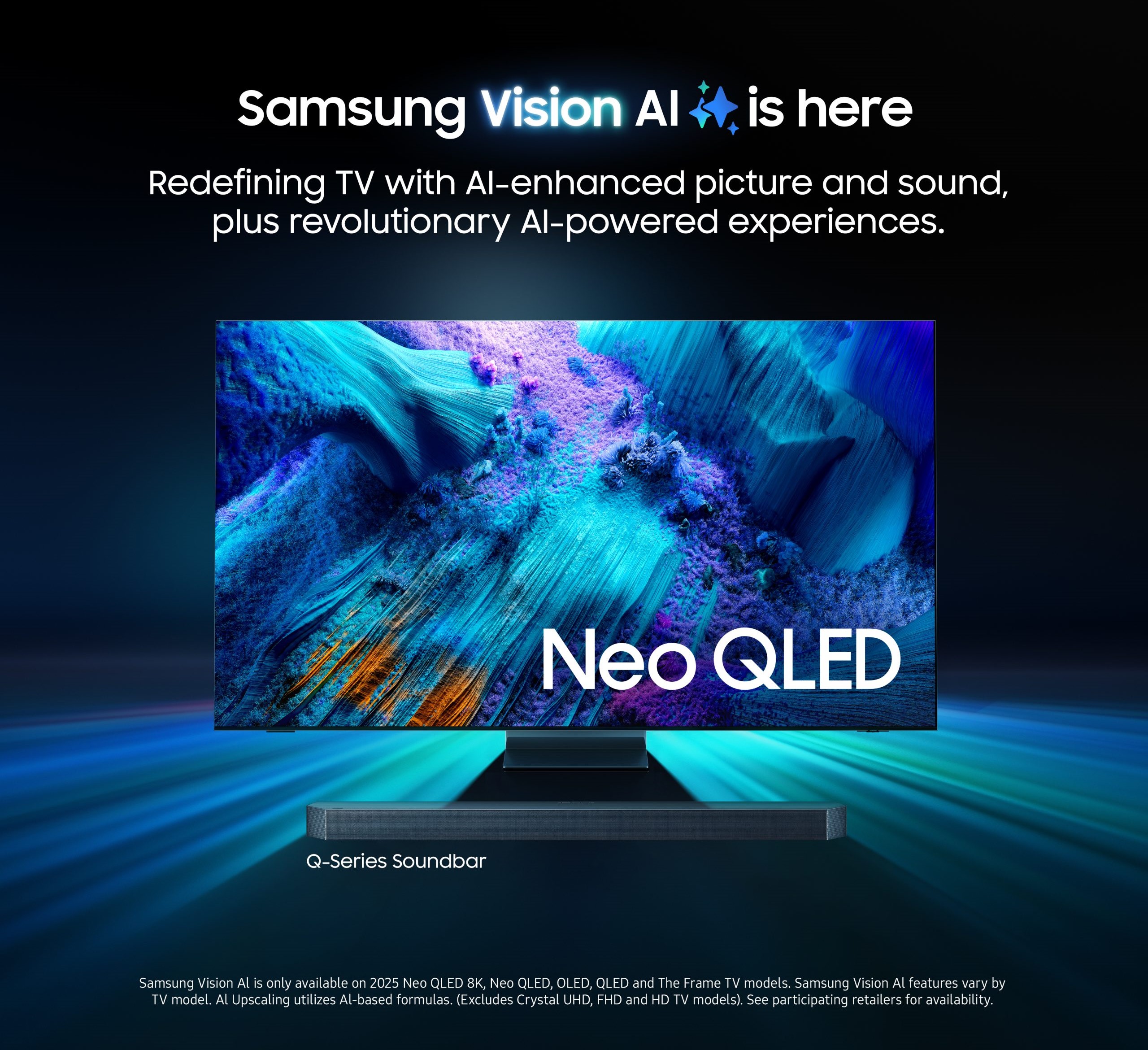 [1] Samsung Vision Al is only available on 2025 Neo QLED 8K, Neo QLED, OLED, QLED and The Frame TV models. Samsung Vision Al features vary by TV model. (Excludes Crystal UHD, FHD and HD TV models)