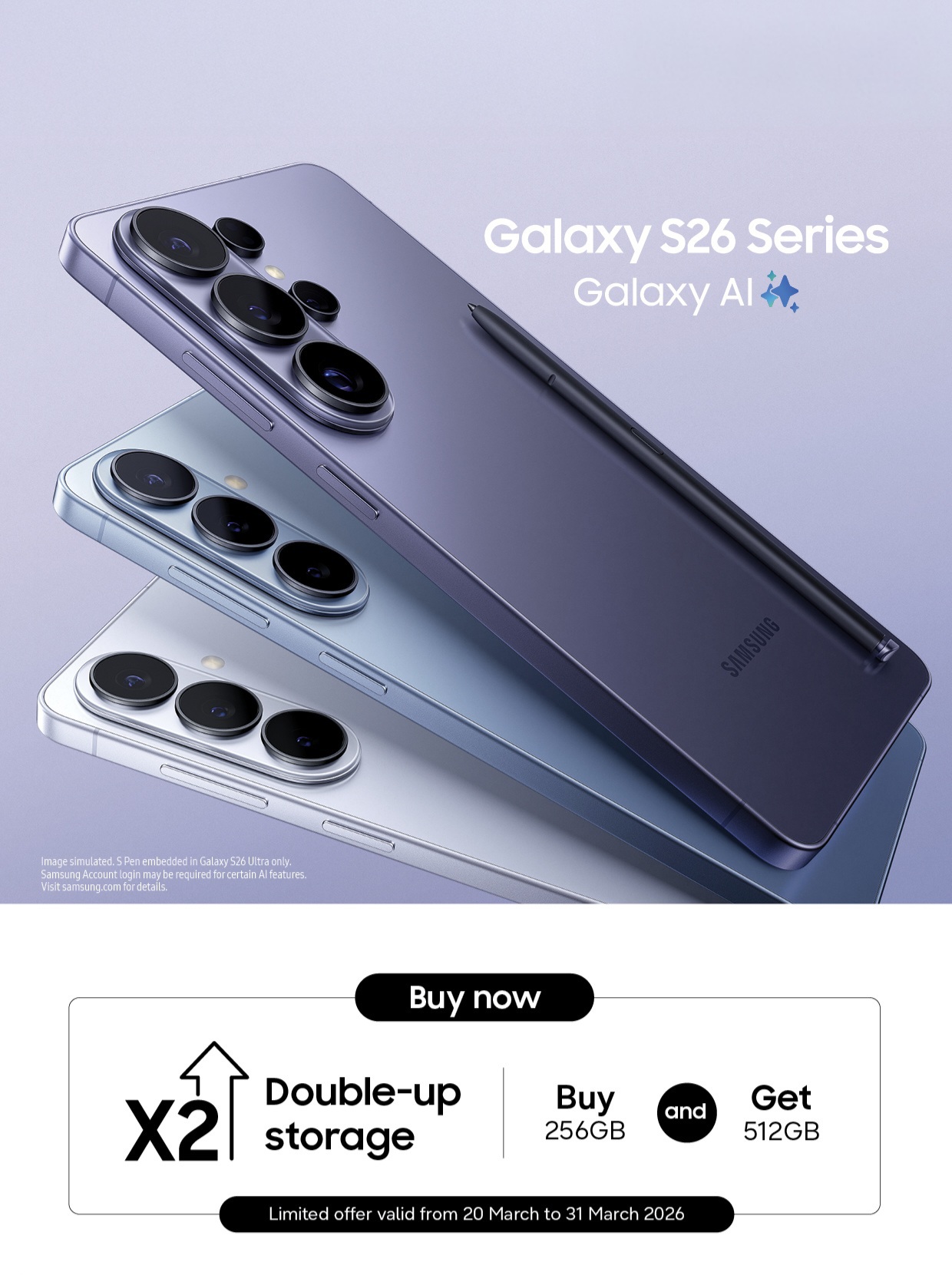 Starting March 20, the Galaxy S26 series is available16 through carriers, retailers Samsung Shop App and Samsung.com. The Galaxy S26 series features a unified design language across all models, with shared colour options including Cobalt Violet, White, Black and Sky Blue alongside the Samsung.com-exclusive Pink Gold and Silver Shadow.